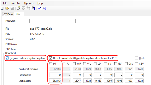 Los datos de retención se sobrescribirán con los valores del nuevo proyecto. De esta forma, si también se descargan el código de programa y los registros del sistema, se tendrá una copia real del PLC maestro. Solamente variarán los registros de no retención cuando se reinicie el PLC.