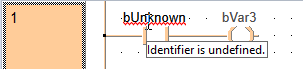 Errors detected while entering text are indicated by red "squiggles" in the editor, e.g. when a variable is not declared. A tooltip explains the corresponding error.