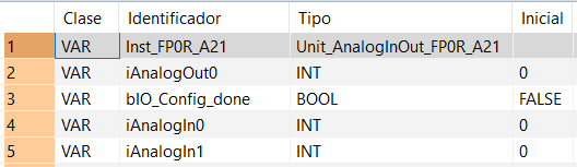 Todas las variables de entrada y de salida utilizadas para la programación de esta función han sido declaradas en la Cabecera de la POU. Se utiliza la misma cabecera de la POU para todos los lenguajes de programación.