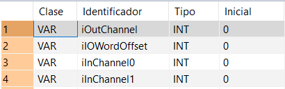 Todas las variables de entrada y de salida utilizadas para la programación de esta función han sido declaradas en la Cabecera de la POU. Se utiliza la misma cabecera de la POU para todos los lenguajes de programación.