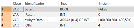 Todas las variables de entrada y de salida utilizadas para la programación de esta función han sido declaradas en la Cabecera de la POU. Se utiliza la misma cabecera de la POU para todos los lenguajes de programación.