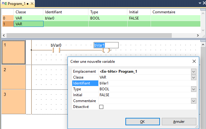 Selon le préfixe des identifiants de variables, Control FPWIN Pro7 sélectionne le type de données BOOL.
