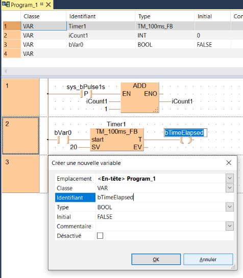 Si la variable n’est pas déclarée dans l’en-tête du POU, la variable sera créée et ajoutée à la déclaration.