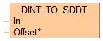 Cette fonction copie les données indépendantes de l’API en entrée In du type de données DINT dans le registre spécial de données DDT défini par la valeur en entrée Offset*. La variable en entrée In est ainsi copiée dans le registre de données DDT(9000+Offset*) ou DDT(90000+Offset*) avec la fonction F0_MV.