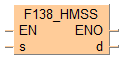 Cette fonction convertit les heures, minutes et secondes de la zone de 32 bits indiquée par s en secondes, si le déclencheur EN est TRUE. Les secondes converties sont sauvegardées dans la zone de 32 bits désignée par d. Les heures, minutes et secondes à convertir ainsi que les secondes converties sont au format BCD. La valeur d’entrée max. des données est de 9999 heures, 59 minutes et 59 secondes, qui seront converties en 35 999 999 secondes au format BCD.