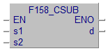 La durée (2 mots) désignée par s2 est soustraite de la date/heure (3 mots) désignée par s1, lorque le déclencheur EN est TRUE. Le résultat est sauvegardé dans la zone (3 mots, même format que s1) désignée par d. Toutes les données utilisées par l’instruction F158 _CSUB sont traitées au format BCD.