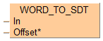 Cette fonction copie les données indépendantes de l’API en entrée In du type de données WORD dans le registre spécial de données DT défini par la valeur en entrée Offset*. La variable en entrée In est ainsi copiée dans le registre de données DT(9000+Offset*) ou DT(90000+Offset*) avec la fonction F0_MV.