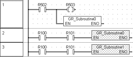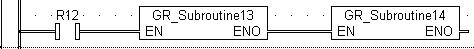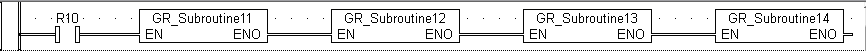 L’instruction FPWIN GR/FPWIN GR7 Call 11 est convertie en 4 éléments : GR_Subroutine11 à GR_Subroutine14 dans l’ordre croissant, chacun appelant sa partie de programme correspondante (1) à (4).