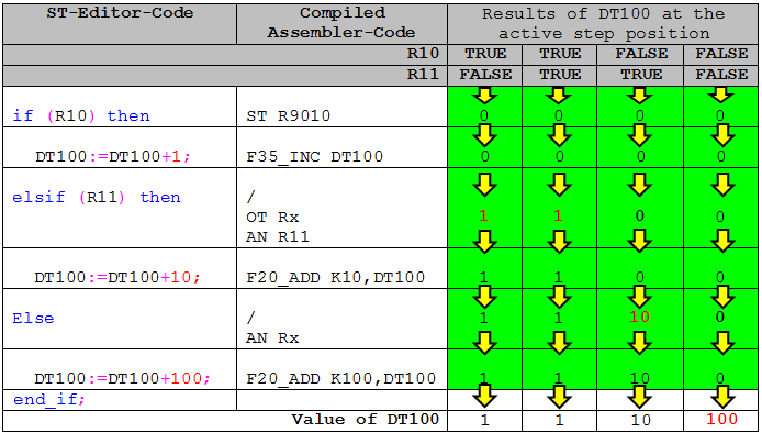 La génération de codes des instructions de contrôle tels que if…end_if et case…end_case n’utilise pas de sauts. A la place, les conditions d’exécution des instructions sont définies en conséquence.
