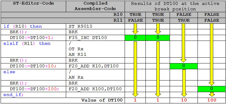 En mode pas à pas, le débogage est exécuté via toutes les lignes valides de l’éditeur ST même si la condition de contrôle est FALSE. Par conséquent, les instructions ne sont pas exécutées. Vous pouvez exécuter le programme jusqu’à la ligne valide suivante en appuyant sur <F10> (Pas à pas sauté) ou <F11> (Pas à pas détaillé).