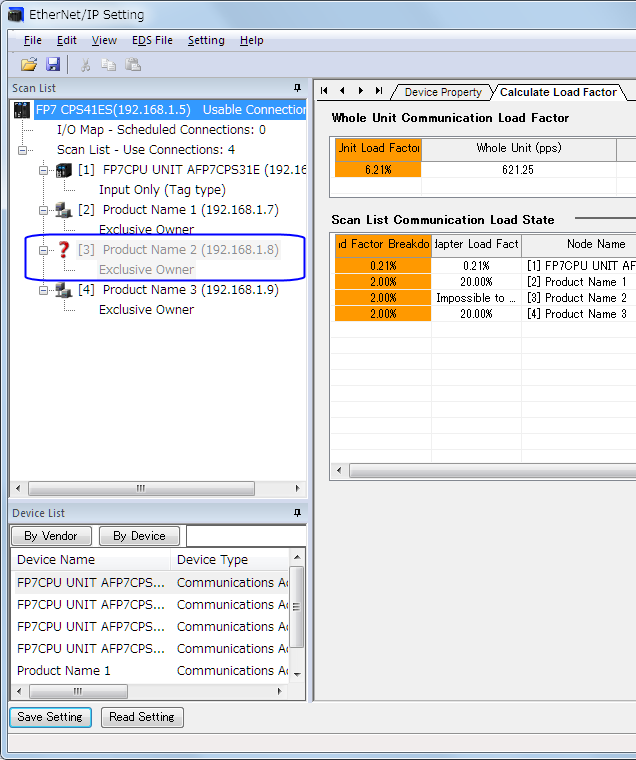 Lorsque des fichiers EDS de dispositifs adaptateurs enregistrés dans la liste des paramètres de scrutations ne sont pas enregistrés dans la liste des dispositifs, ils sont affichés dans la liste des paramètres de scrutations comme dans l’illustration ci-dessous.