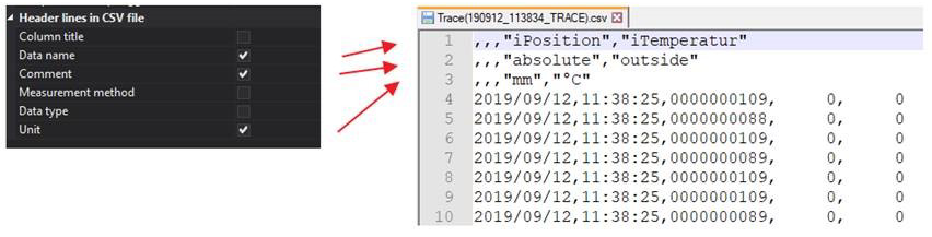L’unité pour l’intervalle entre deux valeurs d’échantillonnage est de 10ms. Les intervalles d’acquisition des données sont sauvegardés. La ligne avec le déclenchement de l’arrêt indique également le temps écoulé entre l’enregistrement des données précédent et le déclenchement de l’arrêt (STOP TRG).
