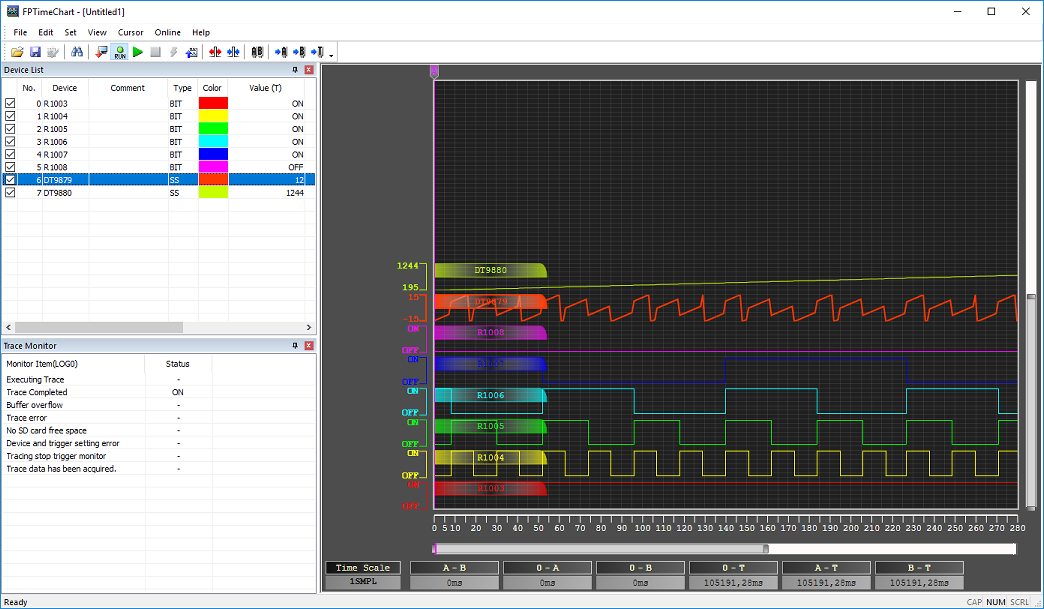 Sur les graphiques, le temps ne peut pas être mesuré avec les curseurs (C, R) lorsque le fichier LOG affiché en tant que chronogramme contient les données enregistrées avec la fonction trace et une condition de déclenchement de l’enregistrement des données autre qu’un intervalle.