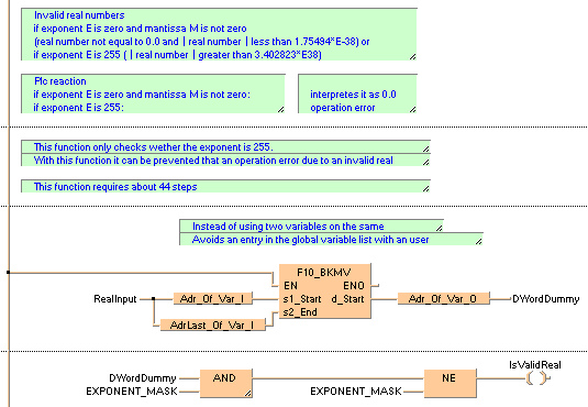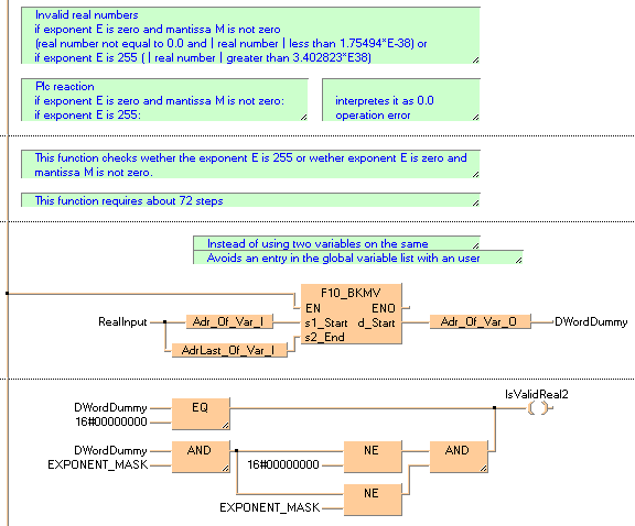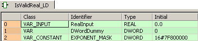 Dans cet exemple, les fonctions IsValidReal et IsValidReal2 sont programmées en schémas à contacts (LD) et en listes d’instructions (LI). Le même en-tête de POU est utilisé pour tous les langages de programmation.