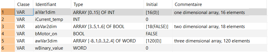iRAnge1 et iRange2 sont des variables de type INT ou des constantes qui doivent être situées dans l’intervalle des valeurs du tableau déclaré. Dans cet exemple, iRange1 est affectée à l’intervalle 3...5 et iRange2 à l’intervalle 1...6 par ex. ARRAY [3..5,1..6] OF BOOL.