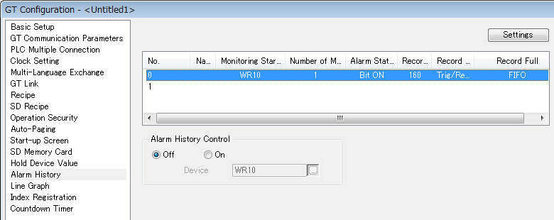 Lorsque l’historique des alarmes ou un groupe ont été définis dans GTWIN, la fonction de contrôle de l’historique des alarmes est disponible. Sélectionnez On, si vous souhaitez l’utiliser puis sélectionnez un registre en tant que registre de contrôle.