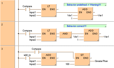 Pour éviter ceci, assurez vous que toutes les fonctions ou blocs fonctions d’un réseau ne sont exécutés que lorsque les fonctions/blocs fonctions précédents ont été exécutés. Le compilateur vérifie que la fonction ou le bloc fonction suivant n’a pas d’entrée EN et que la fonction suivante n’est pas une fonction AND.