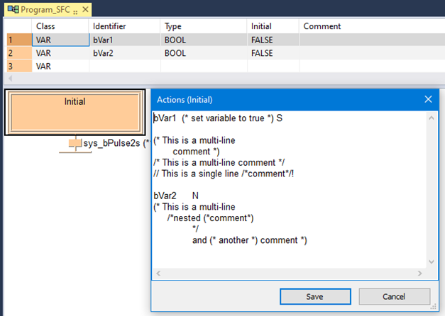 Les actions peuvent être des variables booléennes ou des programmes d’actions en LD, ST, LI ou FBD et doivent être affectées à une étape. Lorsqu’une étape est activée, les actions qui lui sont affectées sont exécutées. Les qualificatifs d’actions affectés aux variables booléennes peuvent être utilisés pour contrôler les actions.