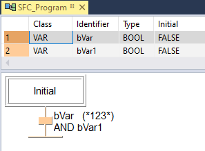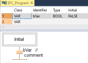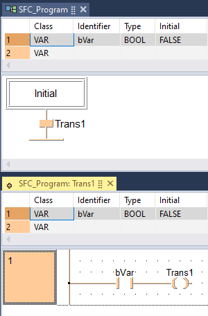 La transition est TRUE lorsque la variable avec le nom de la transition est TRUE. La variable avec le nom de la transition est automatiquement déclarée par Control FPWIN Pro7.