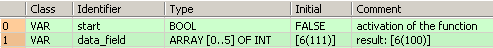 La fonction est exécutée lorsque la variable start est sur TRUE. La fonction copie la valeur 100 dans tous les éléments de la zone de données, c.-à-d. tous les six éléments dans data_field ont la valeur 100.
