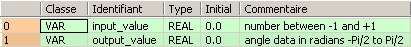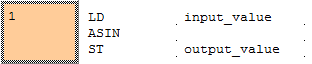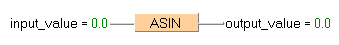 La fonction ASIN calcule l’arc sinus de la variable d’entrée et écrit les données de l’angle en radians dans la variable de sortie. La valeur calculée est située entre - π/2 to π/2.