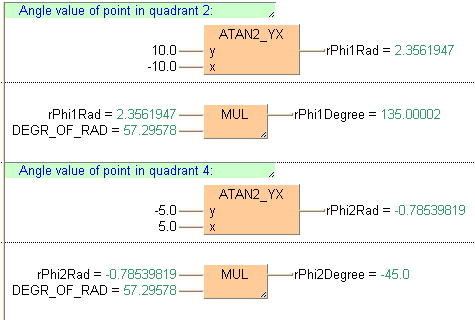 rPhi1Rad:=ATAN2_YX(y := 10.0, x := -10.0); (* Result: 2.3561947 *)