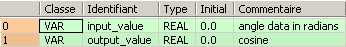 COS calcule le cosinus de la variable d’entrée et écrit le résultat dans la variable de sortie. Les données de l’angle doivent être spécifiées en radians (valeur < 52707176).