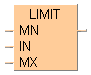 Dans LIMIT, la 1ère variable d’entrée représente la valeur limite inférieure et la 3ème variable d’entrée la valeur limite supérieure. Si la 2ème variable d’entrée est située dans cette limite, elle est transférée à la variable de sortie. Si elle est supérieure à cette limite, la valeur limite supérieure est transférée ; si elle est inférieure à cette limite, la valeur limite inférieure est transférée.