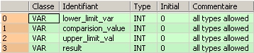 END_VARDans cet exemple, les variables d’entrée (lower_limit_val, comparison_value et upper_limit_val) ont été déclarées. Vous pouvez aussi entrer directement une constante au contact d’entrée d’une fonction.
