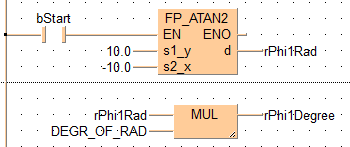 rPhi1Rad:=ATAN2_YX(y := 10.0, x := -10.0); (* Result: 2.3561947 *)