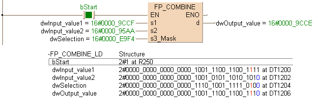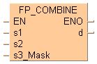 Cette instruction FP combine les deux valeurs en entrées s1 et s2 Les valeurs en bits à l’entrée s3_Mask déterminent la source de chaque bit. Une valeur en bits FALSE signifie que le bit en entrée s1 est utilisé, une valeur en bits TRUE signifie que le bit en entrée s2 est utilisé. Le résultat est sauvegardé dans d.