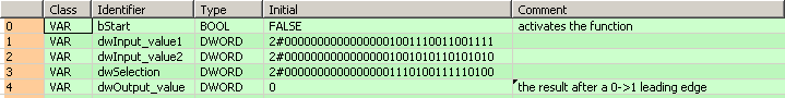 La fonction est exécutée lorsque la variable bStart est définie sur TRUE. Les bits du masque à dwSelection déterminent quels bits sont renvoyés à dwOutput_value. Pour les bits du masque qui sont TRUE (1), les bits correspondants à dwInput_value1 sont renvoyés. Pour les bits du masque qui sont FALSE (0), les bits correspondants à dwInput_value2 sont renvoyés.