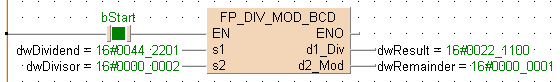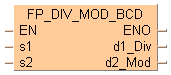 Cette instruction FP divise les données BCD spécifiées par s1 par la valeur de s2 lorsque le déclencheur EN est TRUE. Le résultat est enregistré dans d1_Div et le reste est enregistré dans d2_Mod.