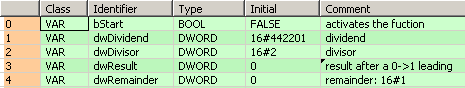 Toutes les variables d’entrée et de sortie utilisées pour programmer cette fonction ont été déclarées dans l’en-tête du POU. Le même en-tête de POU est utilisé pour tous les langages de programmation.