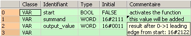 Toutes les variables d’entrée et de sortie utilisées pour programmer cette fonction ont été déclarées dans l’en-tête du POU. Le même en-tête de POU est utilisé pour tous les langages de programmation.