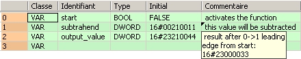 Toutes les variables d’entrée et de sortie utilisées pour programmer cette fonction ont été déclarées dans l’en-tête du POU. Le même en-tête de POU est utilisé pour tous les langages de programmation.