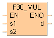 Les données de 16 bits ou constantes équivalentes à 16 bits désignées par s1 sont multipliées par les données de 16 bits ou constantes équivalentes à 16 bits désignées par s2 si le déclencheur EN est TRUE. Le résultat est sauvegardé dans d (zone de 32 bits). Toutes les valeurs de 16 bits sont traitées comme des valeurs integer.