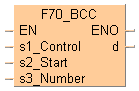Cette fonction calcule le caractère de contrôle de bloc (BCC) utilisé pour détecter les erreurs de transmission d’un message composé d’un nombre d’octets de données ASCII, défini par s3_Number. Le calcul est réalisé à partir de la zone de 16 bits indiquée par s2_Start et selon la méthode de calcul désignée par s1_Control. Le code de contrôle de bloc (BCC) est sauvegardé dans l’octet de poids faible de la zone de 16 bits désignée par d. (BCC est un octet. L’octet de poids fort de d reste inchangé.)