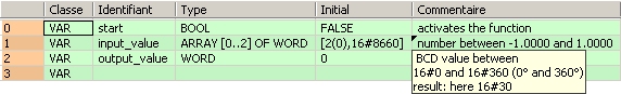 Toutes les variables d’entrée et de sortie utilisées pour programmer cette fonction ont été déclarées dans l’en-tête du POU. Le même en-tête de POU est utilisé pour tous les langages de programmation.