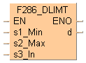 La fonction compare la valeur en entrée s3_In avec la limite inférieure et supérieure. La limite inférieure est indiquée à l’entrée s1_Min et la limite supérieure à l’entrée s2_Max. Le résultat de la fonction est renvoyé en sortie d de la façon suivante :