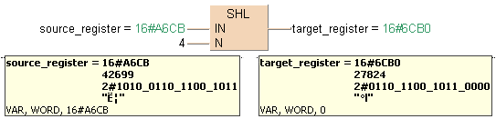 Les premiers N bits (ici 4) de source_register sont décalés vers la gauche, les positions vacantes à droite sont complétées par des zéros Le résultat est écrit dans target_register.