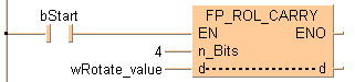 Cette instruction FP effectue une rotation à gauche des données spécifiées par d (vers le bit de poids fort) et selon le nombre de bits spécifié par n_Bits, incluant les données du drapeau de retenue lorsque le déclencheur EN est TRUE.