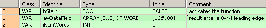 Toutes les variables d’entrée et de sortie utilisées pour programmer cette fonction ont été déclarées dans l’en-tête du POU. Le même en-tête de POU est utilisé pour tous les langages de programmation.
