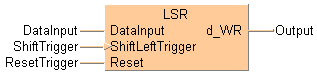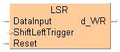 Décale 1 bit de la zone de donnée spécifiée d_WR vers la gauche (décalage en direction du bit de poids fort). Pour utiliser l’instruction LSR, les entrées suivantes doivent être programmées : l’entrée des données DataInput, la condition d’exécution du décalage ShiftLeftTrigger et l’entrée de réinitialisation du déclencheur Reset.