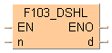 Cette instruction décale la valeur de la sortie d vers la gauche. Le nombre de bits de la sortie d à décaler vers la gauche est spécifié par la valeur affectée à l’entrée n. Ce décalage peut être compris entre 0 et 255 (uniquement l’octet de poids faible de n est effectif). Les bits effacés à cause du décalage sont mis à 0. Lorsque l’entrée n = 0, aucun décalage n’est exécuté. Une distance de décalage supérieure à 32 n’a pas de sens car lorsque n = 32, la valeur de la sortie d est déjà complétée avec des zéros. Le bit en position 31-n (le dernier bit décalé à gauche) est simultanément sauvegardé dans la variable système sys_bIsCarry (drapeau de retenue) et peut être évalué en conséquence. Lorsque n = 0, le contenu du drapeau de retenue ne change pas