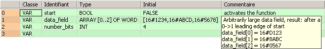END_VARDans cet exemple, la variable d’entrée number_bits est déclarée. Vous pouvez aussi entrer directement une constante au contact d’entrée de la fonction.