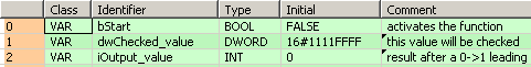 Toutes les variables d’entrée et de sortie utilisées pour programmer cette fonction ont été déclarées dans l’en-tête du POU. Le même en-tête de POU est utilisé pour tous les langages de programmation.