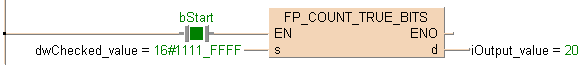 END_VARLa fonction est exécutée lorsque la variable bStart est définie sur TRUE. Le nombre de bits qui sont TRUE dans l’équivalent binaire de 16#1111FFFF est 20.