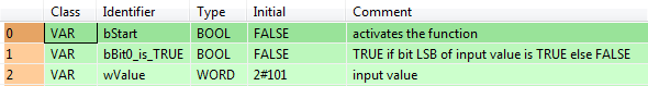 Toutes les variables d’entrée et de sortie utilisées pour programmer cette fonction ont été déclarées dans l’en-tête du POU. Le même en-tête de POU est utilisé pour tous les langages de programmation.