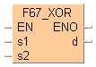 Cette instruction exécute une opération OU exclusif de chaque bit de la constante équivalente 16 bits ou de la donnée 16 bits spécifiée par s1 et s2 lorsque le déclencheur EN est TRUE. Le résultat de l’opération OU exclusif est sauvegardé dans la zone de 16 bits spécifiée par d. Lorsque la constante équivalente à 16 bit est spécifiée par s1 ou s2, l’opération OU exclusif est exécutée qu’après conversion de la constante en expression binaire sur 16 bits. Vous pouvez utiliser cette instruction pour déterminer le nombre de bits identiques dans deux données de 16 bits.